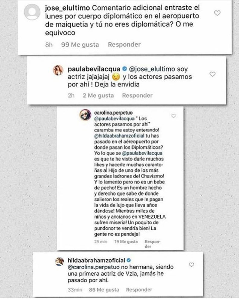 “Comentario adicional, entraste el lunes por cuerpo diplomático en el Aeropuerto de Maiquetía, y tú no eres diplomática? o me equivoco”, comentó el seguidor de la actriz.