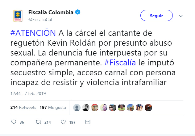 La Fiscalía General de Colombia, confirmó este jueves que el cantante Kevin Roldan fue enviado a la cárcel por presunto delito de abuso sexual.