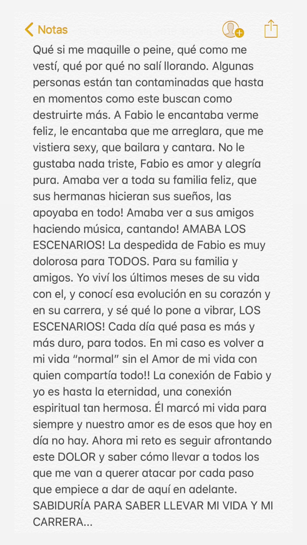 “Qué si me maquillé o peiné, qué como me vestí, que por qué no salí llorando. Algunas personas están tan contaminadas que hasta en momentos como este buscan como destruirte más. A Fabio le encantaba verme feliz, le encantaba que me arreglara, que me vistiera sexy, que bailara y cantara. No le gustaba nada triste”, escribió.