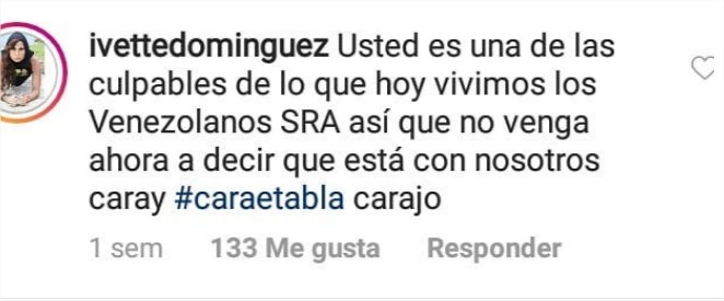 A una de las personas que tampoco le agradaron los videos que publicó la ex Fiscal General, fue a la actriz Ivette Domínguez quien le comentó en su publicación: “Usted es una de las culpables de lo que hoy vivimos los venezolanos señora, así que no venga a decir que está con nosotros caray“, acompañado de la etiqueta #Caraetabla.