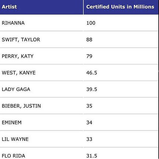 En 2015, Rihanna se convirtió en la artista con más ventas digitales de toda la historia, al superar las 100 millones de unidades/descargas, según dio a conocer entonces la Asociación de la Industria Discográfica estadounidense.