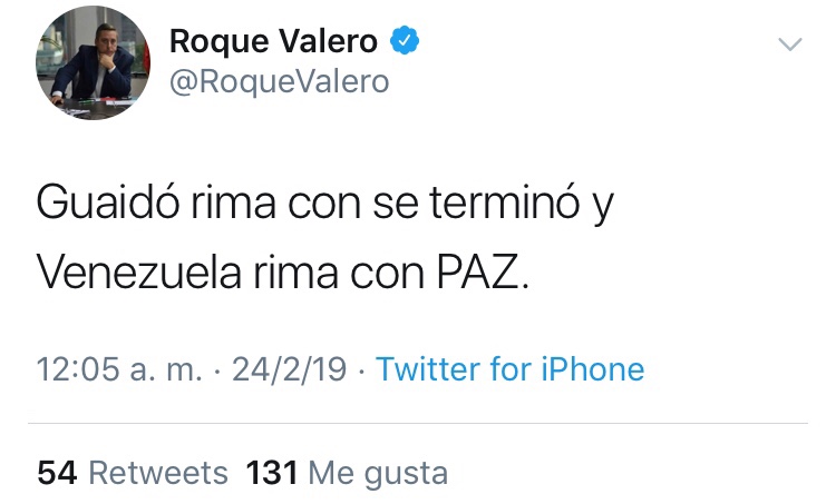En su cuenta de Twitter, Roque Valero, quien también es recordado por componer un par de éxitos musicales hace varios años, escribió: «Guaidó rima con se acabó y Venezuela rima con paz».