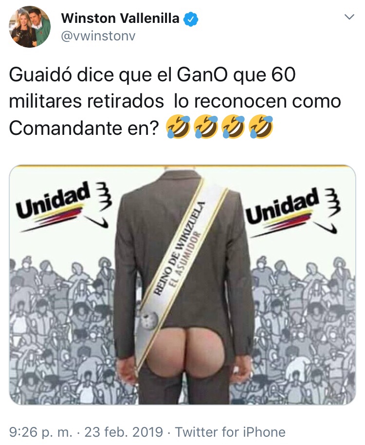 Luego que aproximadamente 60 militares decidieran su blevarse y ponerse del lado de la Constitución, Winston Vallenilla publicó en un tuit: “Guaidó dice que el gano que 60 militares retirados lo reconocen como comandante en? ????”.