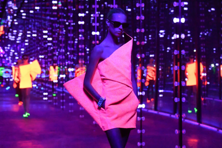 El momento cumbre de la noche fue un llamativo desfile de neón y luces para la colección de invierno, donde la mayoría de los diseños estaban coronados con un gigante lazo, tendencia de esta temporada en casi todos los desfiles.