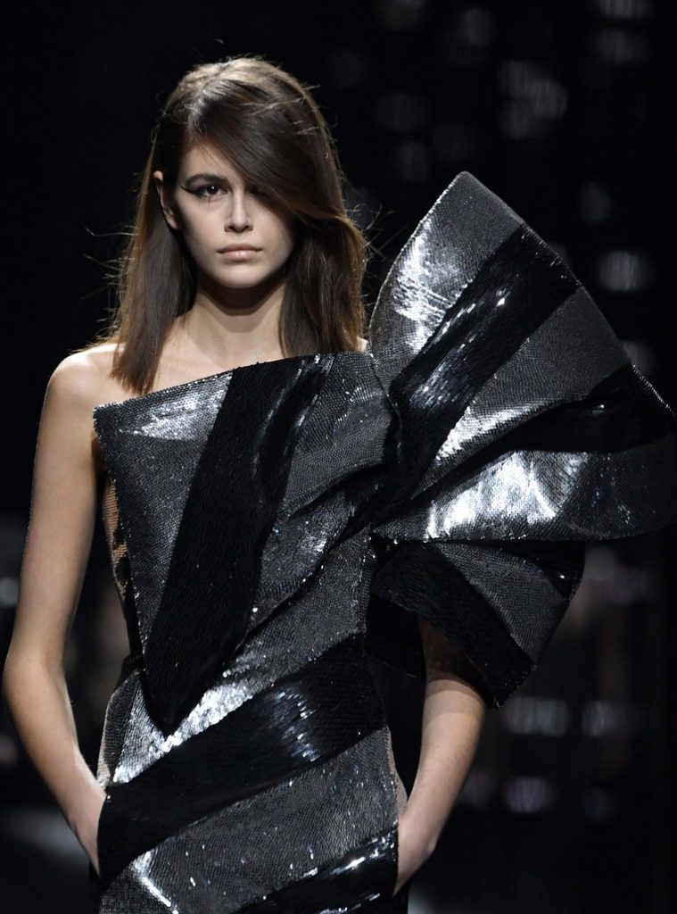 Kaia también lució un minivestido negro y plateado brillante adornado con un gran lazo por segunda vez durante el show dirigido por Nathalie Canguilhem.