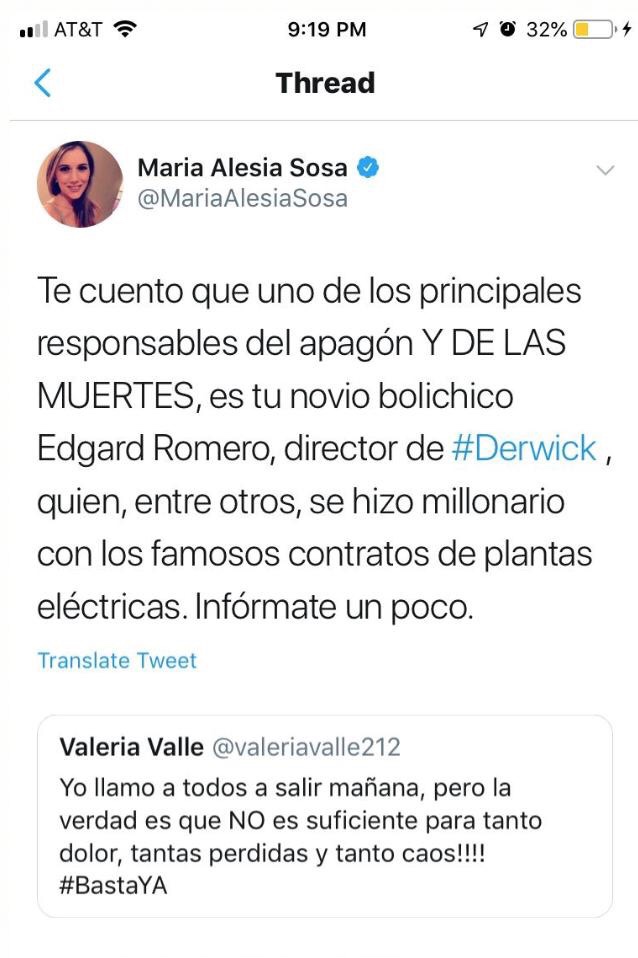 María Alesia Sosa citó el tweet añadiendo: «Te cuento que uno de los principales responsables del apagón Y DE LAS MUERTES, es tu novio bolichico Edgard Romero, director de #Derwick, quien, entre otros, se hizo millonario con los famosos contratos de plantas eléctricas».