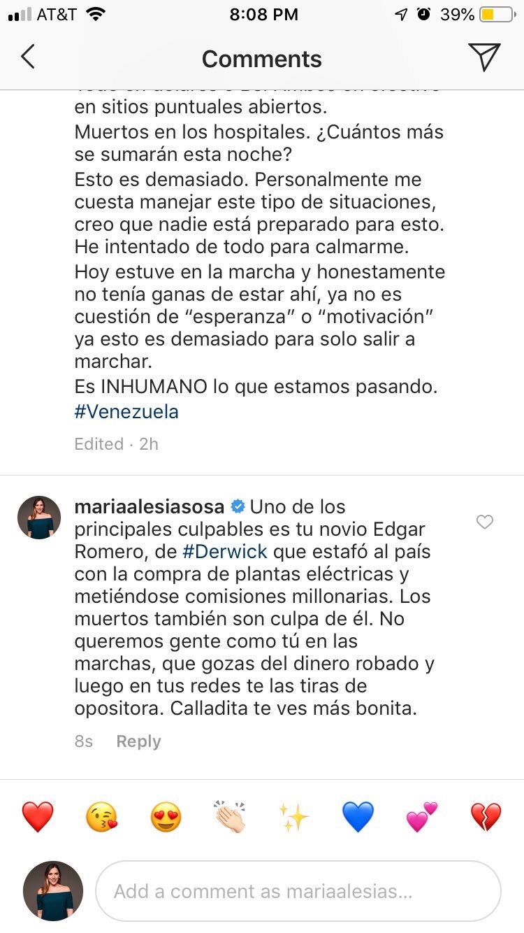 En su cuenta de Instagram, Alesia Sosa realizó un comentario en una publicación de la presentadora en la que se mostraba consternada por la muerte de varios venezolanos en los hospitales debido a la falta de plantas eléctricas de emergencia.