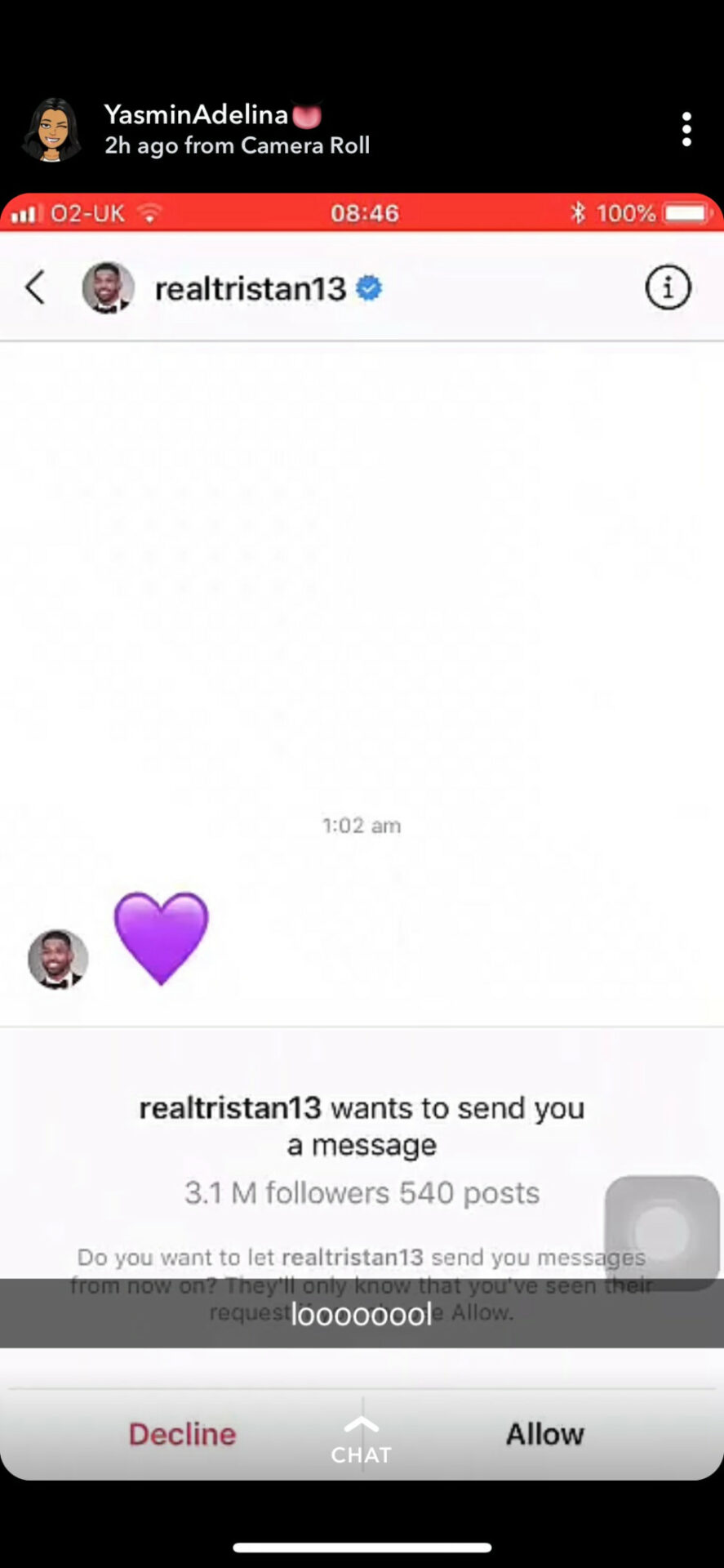 La influyente Yasmin Adelina, de Londres, reveló que el jugador de balonceesto le envió un corazón púrpura después de seguirla en Instagram.