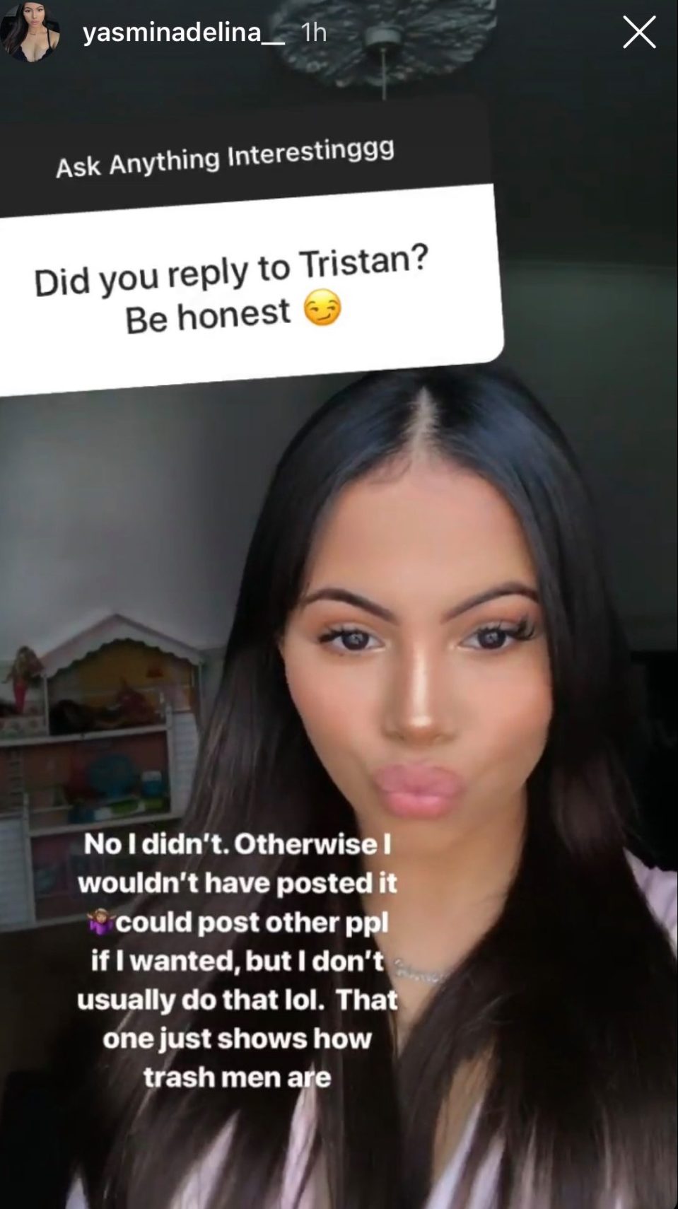 No impresionada por el movimiento, la adolescente le dijo a sus seguidores que no contestó, y agregó: «Es una pequeña muestra de lo basura que son los hombres».