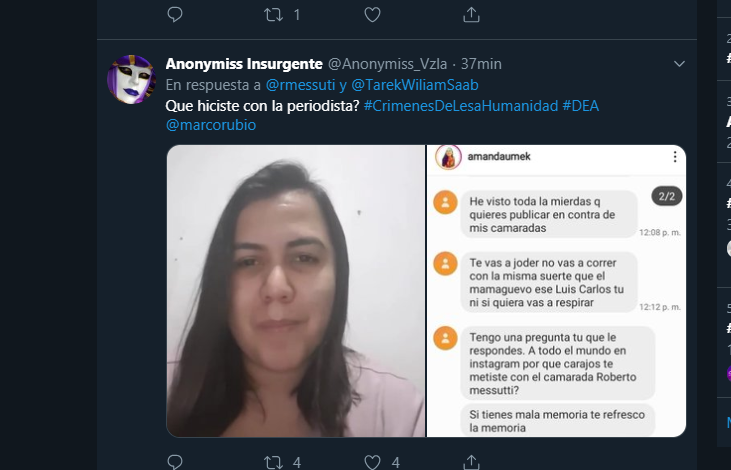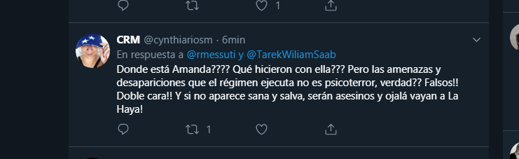 «Donde está Amanda???? Qué hicieron con ella??? Pero las amenazas y desapariciones que el régimen ejecuta no es psicoterror, verdad?? Falsos!! Doble cara!! Y si no aparece sana y salva, serán asesinos y ojalá vayan a La Haya!» comentó una usuario, entre los miles que recurrieron a las redes sociales para exigir noticias de Amanda.
