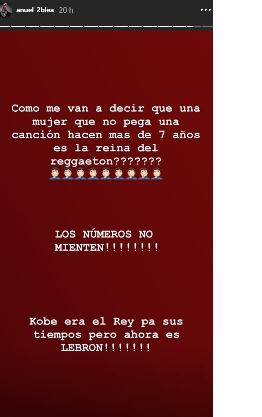 “¿Cómo me van a decir que una mujer que no pega una canción hace más de siete años es ‘la Reina del reguetón’? ¡Los números no mienten! ¡Kobe era ‘el Rey’ pa’ su tiempo, pero ahora es Lebrón!”, escribió Anuel en una historia de Instagram.