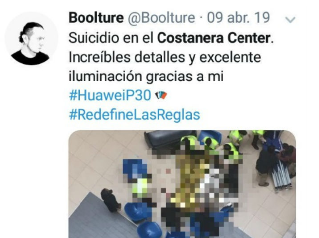 «Suicidio en el Costanera Center. Increibles detalles e ilumación gracias a mi Huaiwei P30 Pro», escribió el joven.