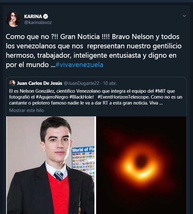 En el tuit original decía: «El es Nelson González, cientifico Venezolano que integra el equipo del #MIT que fotografió el #AgujeroNegro #BlackHole! #EventHorizonTelescope. Como no es un cantante o pelotero famoso nadie le va a dar RT a esta gran noticia. Viva #Venezuela», celebrando el logro científico de un supuesto venezolano que en realidad es Jordi El Niño Polla, un productor y actor de cine para adultos.