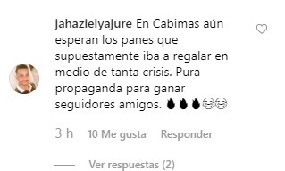 «En Cabimas aún esperan los panes que supuestamente iba a regalar en medio de tanta crisis. Pura propaganda para ganar seguidores amigos. ?????», comentó uno de los internautas.