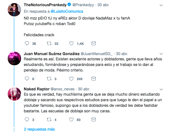 «Es que, es verdad, hay muchísima gente que se deja mucho dinero estudiando doblaje y sacando sus respectivos estudios para que luego le den el papel a un youtuber famoso,supongo que a los dobladores de verdad les debe fastidiar bastante. Las escuelas de doblaje son muy caras», escribió alguien más.