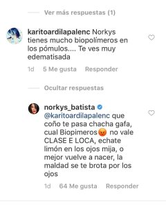 La furio de Norkys se desató porque la usuaria le comentó: “Norkys, tienes muchos biopolímeros en los pómulos. Te ves muy edematizada”.