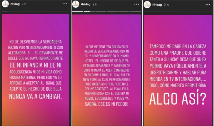 Entre la declaraciones que otorgó al programa Suelta la Sopa, Fridda se refirió a su madre y aseguró que no es fácil vivir con una persona que sufre de adicciones. «Se conoce que Alejandra Guzmán tiene una historia de adicciones, no tiene nada de malo, pero también hay programas, asociaciones y todo lo que quieras que tratan a la familia del adicto, porque lidiar, crecer, convivir y ser parte de un núcleo donde hay una adicción o una enfermedad, te afecta».