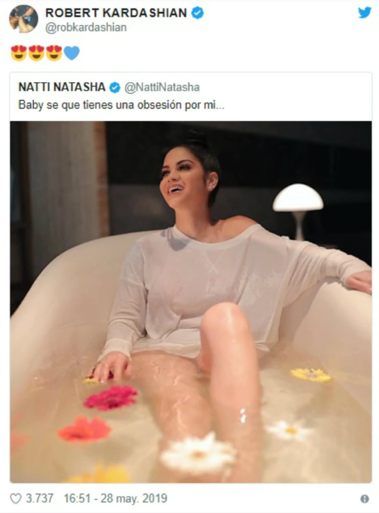 El hermano de las Kardashian ha dejado al descubierto su admiración por la cantante, pues ha dado el primer paso en el coqueteo. La semana pasada Natti publicó una foto donde se le aprecia recostada en una tina de baño, a la cual Rob no tardó en responder, pues comentó la publicación con unos emojis de “enamorado” y un corazón.