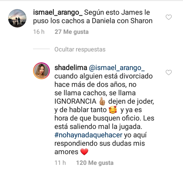 La contundente respuesta fue referente a el comentario: “Según esto James le puso los cachos a Daniela con Shannon” a lo que de forma muy tajante la modelo acotó “cuando alguien está divorciado hace más de dos años, no se llama cachos, se llama ignorancia. Dejen de joder y de hablar tanto. Y ya es hora de que busquen oficio. Les está saliendo mal la jugada”.