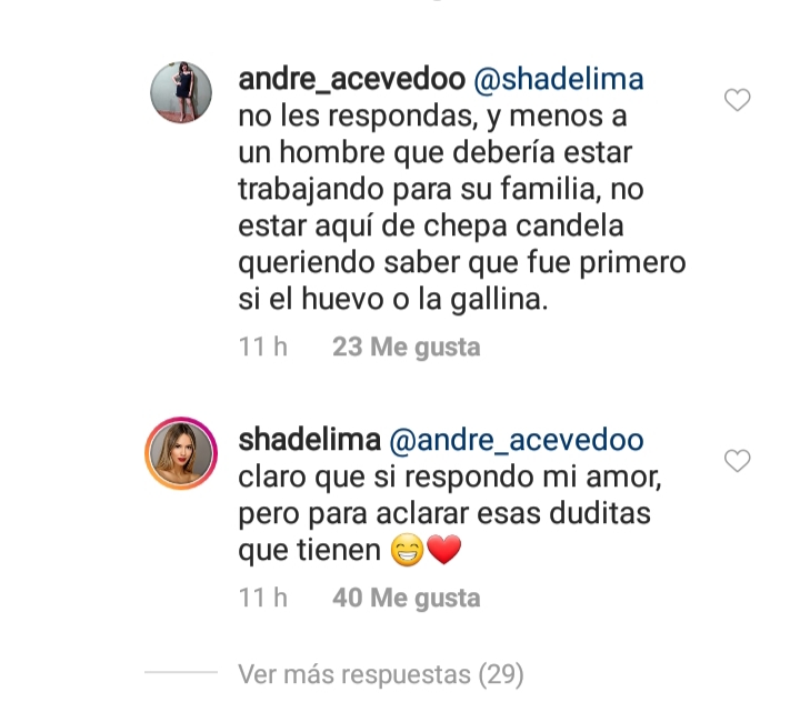 A su vez de Lima aprovechó el mismo espacio para enviar un mensaje a una seguidora que respondió al comentario negativo en defensa de la modelo, “no le respondas, y menos a un hombre que debería estar trabajando para su familia, no estar aquí de chepa candela queriendo saber qué fue primero si el huevo o la gallina” dijo la seguidora, a lo que Shannon respondió: “Claro que sí respondo mi amor, pero para aclarar esas duditas que tienen”.