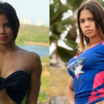 A la cantante se le vio con un look muy fresco, en un enterizo ajustado rojo y de flores, además posó con su cabello al natural y húmedo.