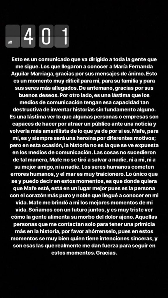 “La historia no es la que se ve expuesta en los medios de comunicación. Las cosas no sucedieron así. ‘Mafe’ no se tiró a salvar a nadie, ni a mí, ni a su mejor amigo. Los seres humanos cometen errores y el mar es muy traicionero”, habría escrito Julián en dicha red social.