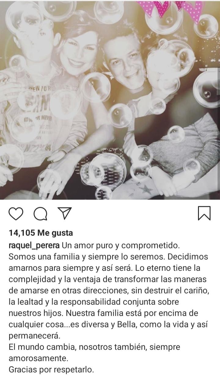 «Un amor puro y comprometido. Somos una familia y siempre lo seremos. Decidimos amarnos para siempre y así será. Lo eterno tiene la complejidad y la ventaja de transformar las maneras de amarse en otras direcciones, sin destruir el cariño, la lealtad y la responsabilidad conjunta sobre nuestros hijos. Nuestra familia está por encima de cualquier cosa…es diversa y bella, como la vida y así permanecerá. El mundo cambia, nosotros también, siempre amorosamente. Gracias por respetarlo», ha escrito la pareja en su respectivas cuentas de Instagram.