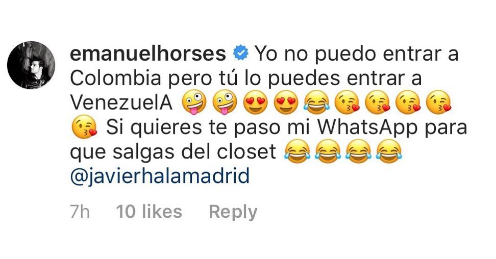Sin embargo el video de Javier Romero («JavierHalaMadrid») si logró provocarlo, pues justo en esa publicación Emanuel le respondió «Yo no puedo entrar a Colombia, pero tu no puedes entrar a Venezuela, si quieres te paso mi WhatsApp para que salgas del closet» le escribió.