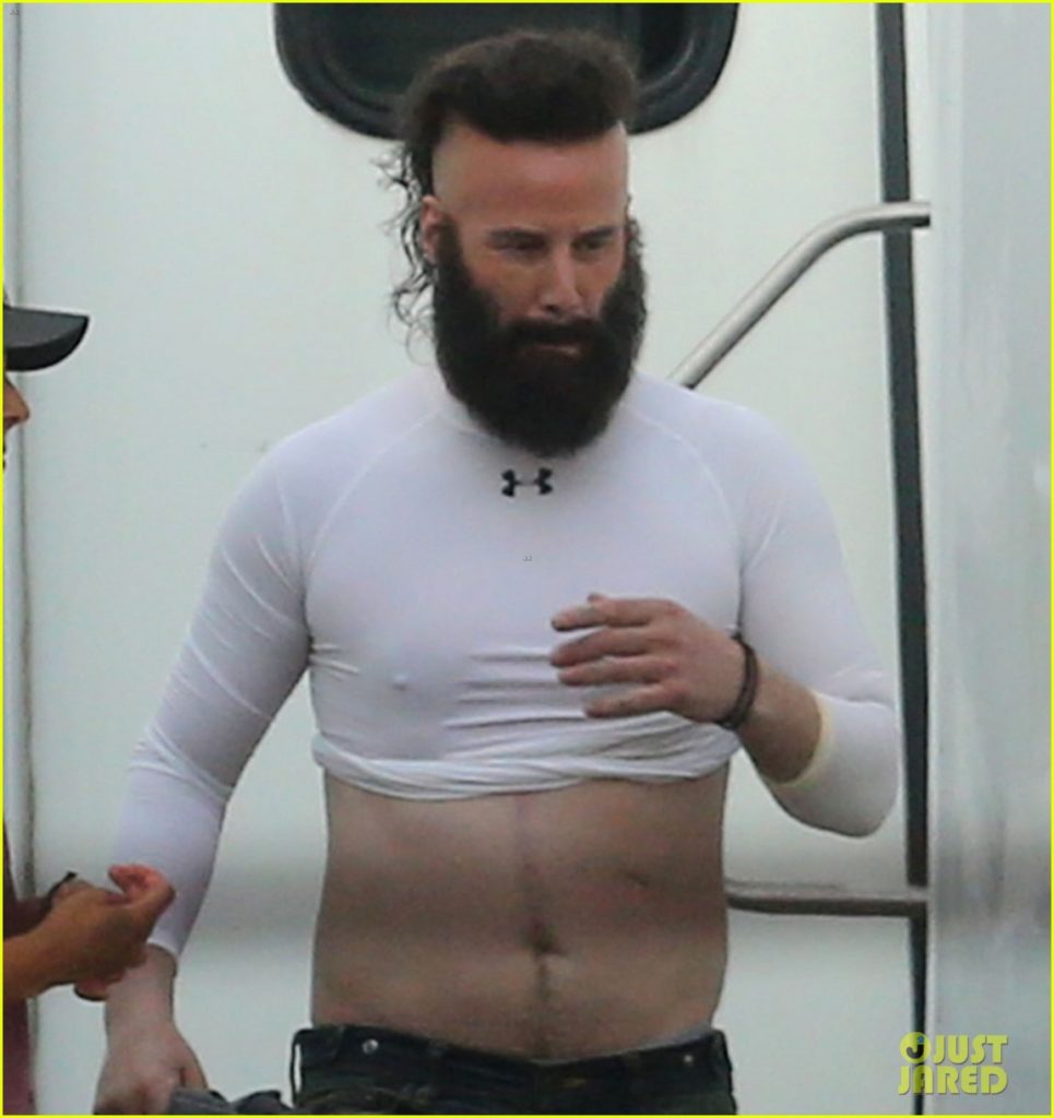 El actor de 55 años llevaba una gran barba espesa y su cabello en un mohawk mientras filmaba una escena el jueves 1 de agosto en Nueva Orleans, Luisiana.