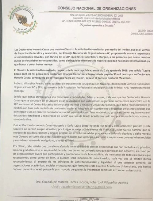Pese a que eliminó el comunicado, agregó en otro tuit: «quiénes son esos otros que se cuelgan de mí para aparecer en la prensa y ¿qué dicen de los otros 19 que recibieron el título conmigo? (…) les reto públicamente a que muestren las pruebas», añadió Bozzo.