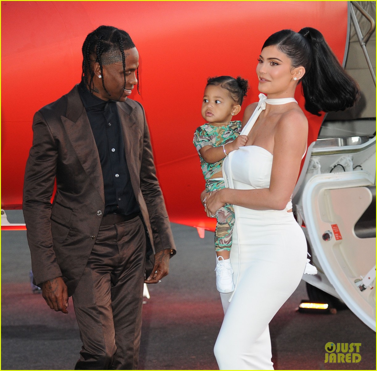 La magnate del maquillaje de 22 años y la estrella de la realidad mostró sus curvas con un vestido blanco mientras Travis lucía un traje marrón de seda y Stormi vestida con un atuendo verde y multicolor para la alfombra roja.