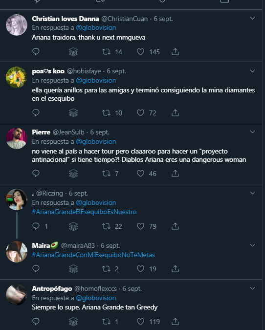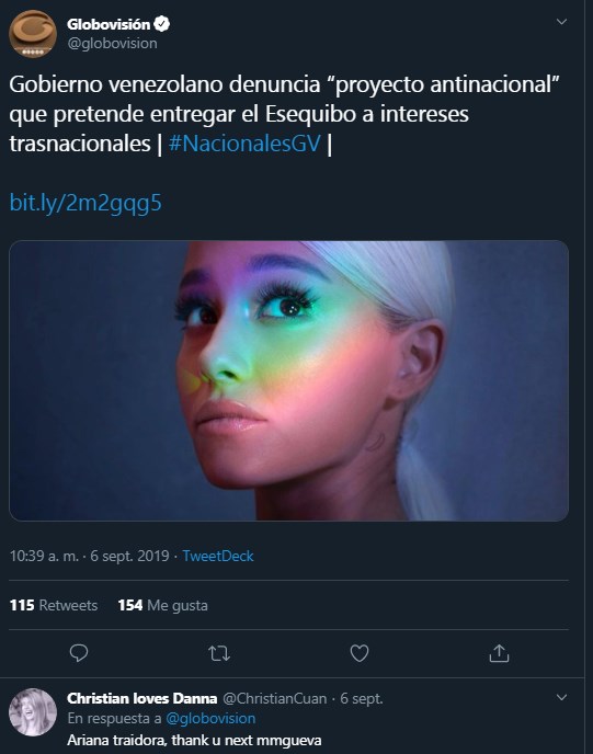 «Yo sabía que Ariana Grande se quería robar el Esequibo», «Ariana grande lista para robar el esequibo JAJAJAJAJAJAJAJAJAJAJJA», «Ariana, el Esequibo es venezolano», son algunos de los miles de tuits relacionados a la confusión que generó revuelo.