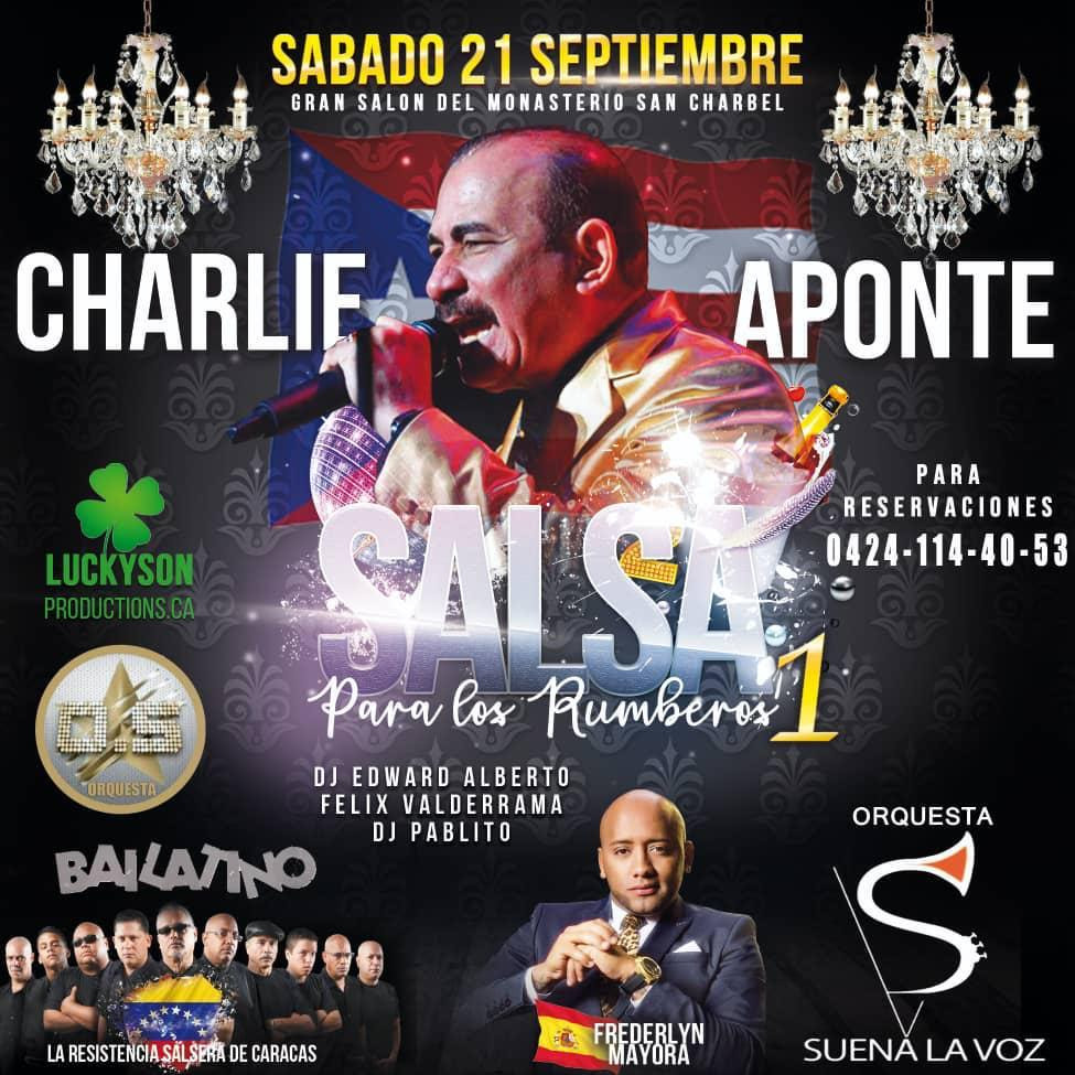 La cita será en el Monasterio San Charbell en Caracas, a partir de las 8:00pm, donde abrirán la noche: O.S Orquesta, Bailatino, Frederlyn Mayora y la orquesta Suena La Voz, para darle la bienvenida al artista internacional Charlie Aponte quien viene acompañado de su director musical Samy García y deleitará al público con sus temas “Se Nos Perdió el Amor”, “Aguacero”, “No digas que no”, “Timbalero”, “El Sediento”, “Compañera Mía”, entre otros.