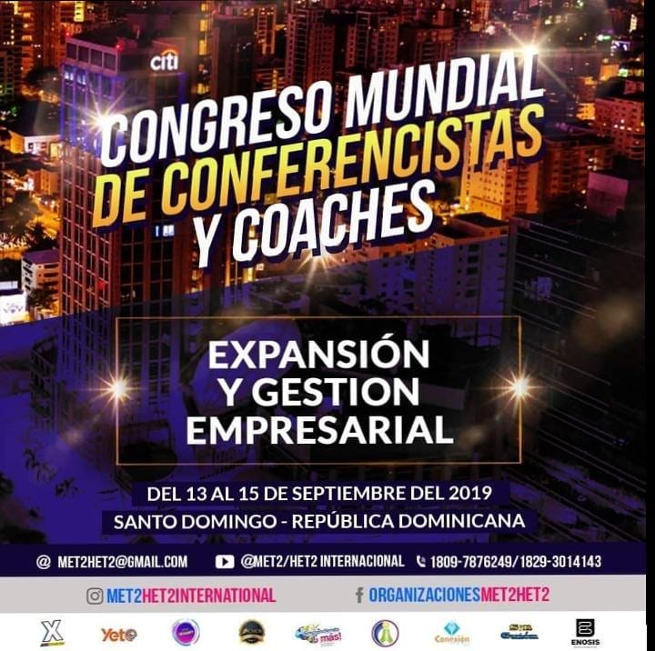 María cici/ UK.- Met2 & Het2 como una Organización Internacional de exitosa trayectoria organiza su 1er Congreso Mundial de Conferencistas y Coaches y su 4to evento en República Dominicana. Este Evento sobre la expansión y enfoque empresarial tendrá lugar los días 13 y 14 de septiembre con la participación de 18 reconocidos ponentes originarios de EEUU, México, Venezuela, Perú, Honduras y República Dominicana.