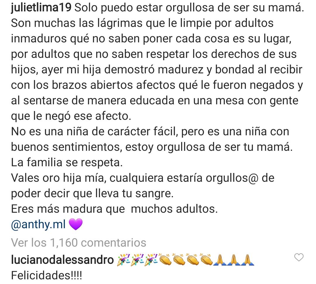 Ante las declaraciones de Juliet, los seguidores empezaron a especular sobre quien hablaba la interprete ¿Yelena Maciel? ¿Patricia Schwarzgruber? ¿o ambas?… Lo que si quedó bien claro es que parte de esos «adultos inmaduros» estaban sentados en la mesa compartiendo con su hija Antonella, por lo que no tuvo «pelos en la lengua» para guardarse lo que pensaba.