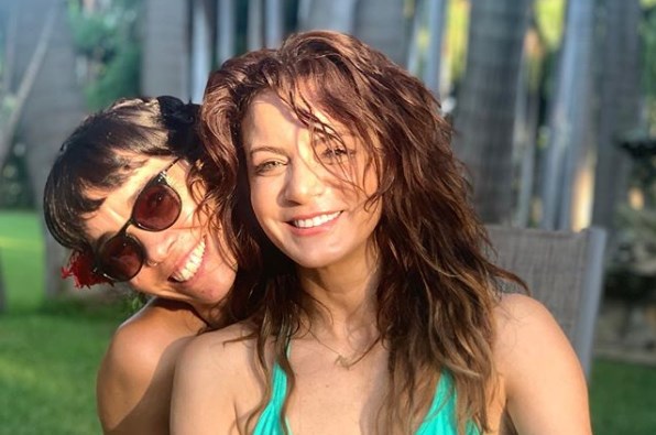 En aquel momento, la actriz que alcanzó la fama con la novela ‘Cuando seas mía’ y Mañana es Para Siempre lució un bikinazo de infarto en color verde que dejó al descubierto su pechonalidad mientras Kar apareció atrás de ella, abrazándola y también luciendo un bañador.