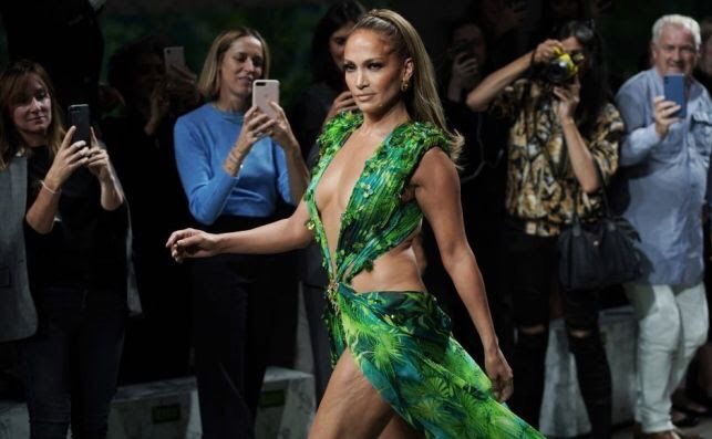 Jennifer Lَpez al famoso desfile de Versace en Milلn, en donde caminَ sobre la pasarela con un vestido nacido del modelo que vistiَ hace casi 20 aٌos en una ceremonia de los premios Grammy.