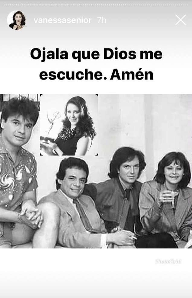 A través de su Instagram, Senior publicó una historia de la famosa fotografía en la que aparecen Juan Gabriel, Rocío Dúrcal, Camilo Sesto y el recién fallecido José José. En la imagen añadió una foto de Angie Pérez.