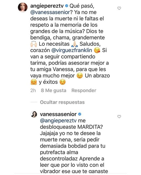 Luego de esto, la periodista le respondió a Senior: “¿Qué pasó, Vanessa Senior? Ya no me desees la muerte ni le faltes el respeto a la memoria de los grandes de la música. Dios te bendiga chama, grandemente, lo necesitas”.