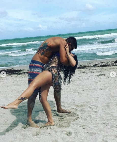 Mientras su esposo la besa, Beatriz Solís levanta su pierna con su potente trasero y deja ver su tatuaje, así como su sexy bronceado y su bikini oscuro que complementó con una especie de pareo de playa de red.