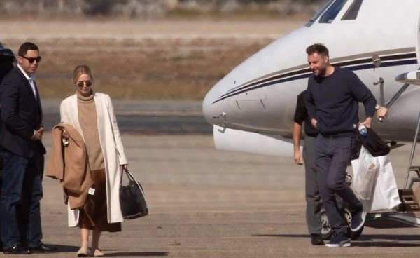 La pareja fue captada descendiendo del jet privado, la novia de 29 años de edad traía un suéter, una falda marrón, todo debajo de un abrigo blanco y unos lentes de sol redondos, mientras cargaba sus maletas. Maroney de 34 años, por su parte usó unos tenis, pantalones y suéter azules.