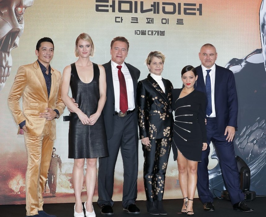 A Arnold Schwarzenegger y Linda Hamilton se unieron en el evento sus compañeros de reparto Mackenzie Davis, Natalia Reyes y Gabriel Luna, así como el director de la película, Tim Miller.