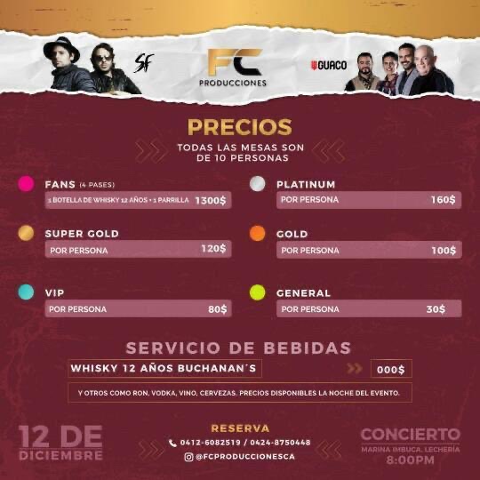 El próximo 12 de diciembre, Guaco y Servando y Florentino llegarán a Lechería, Anzoátegui para ofrecer un concierto organizado por FC Producciones C.A., que dejó impresionado a los fanáticos por el altísimo costo —en dólares— de las entradas.