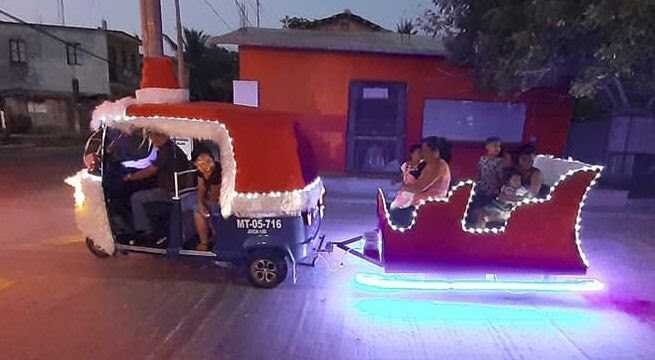 Don Jerónimo es el dueño de este inusual vehículo que con luces navideñas y simulando tener un gorro de Santa Claus en la cabecera del mototaxi, pasea a niños y familias por distintas calles.