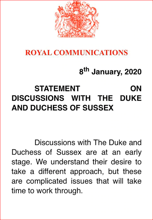“Las discusiones con el duque y la duquesa de Sussex se hallan en un estado preliminar. Comprendemos su deseo de iniciar otro camino, pero son cuestiones complicadas que requieren tiempo para ser resueltas”, explicó el comunicado de la Familia Real británica.