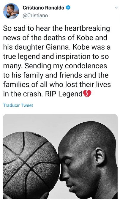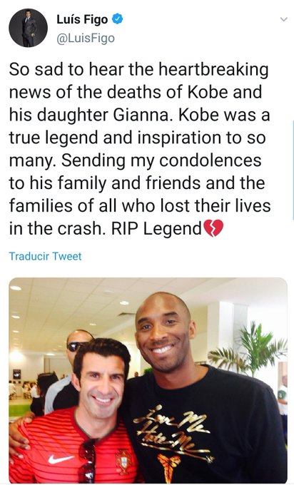 En el Twitter del delantero de la Juventus F. C se pudo leer las condolencias hacia el astro de los Lakers; sin embargo, horas más tarde también se puso leer el mismo texto en la cuenta de su colega y paisano, Luis Figo.