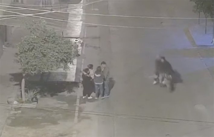 Mientras 4 personas se encontraban en la calle, charlando, los delincuentes dieron un par de vueltas montados en su motocicleta, como viendo la manera en que iban a atacar, mientras las víctimas continuaban en lo suyo, sin percatarse de lo que se estaba planeando.