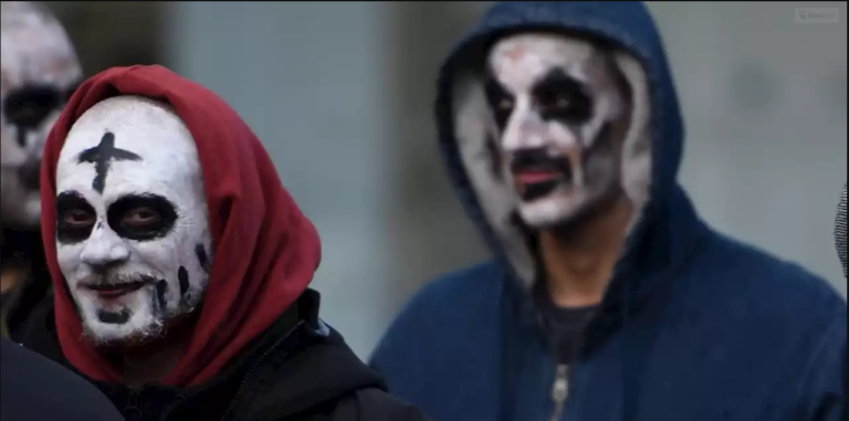 Este grupo de hombres, que ataca a otro por la calle, lleva la cara pintada de blanco y los ojos y la zona de la boca de negro. Uno de ellos incluso lleva una cruz en la frente. Por ahora, sabemos que los villanos que aparecerán en la película son Edward Nashton/Enigma, Carmine Falcone y Oswald Cobblepot/Pingüino. Y, de los tres, el que más ligado está a esa estética es el último.