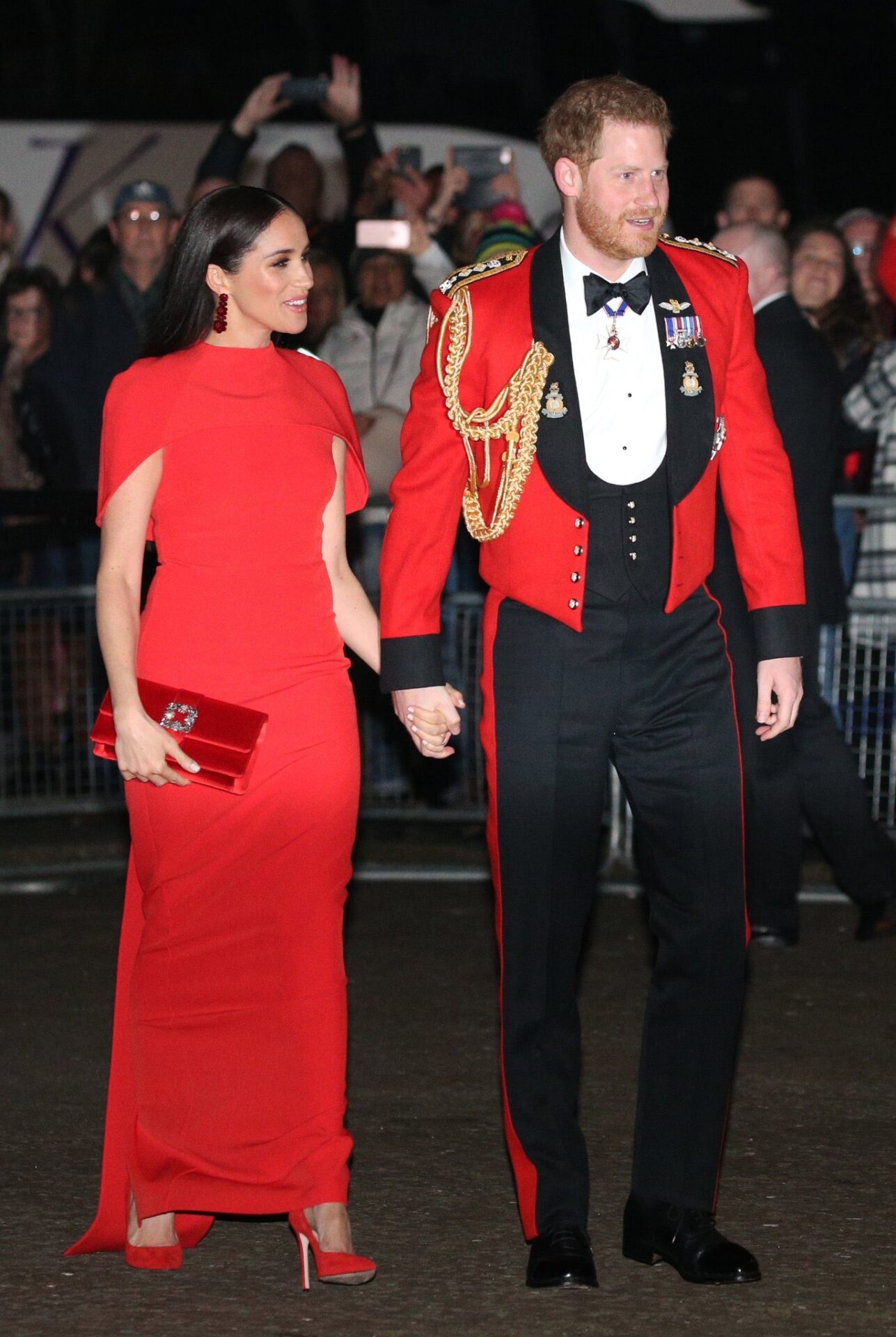Los duques de Sussex acapararon las miradas de todos los presentes. La actriz optó por un diseño rojo para combinarse con su esposo, quien acudió a la cita con el uniforme de la marina, negro y rojo.