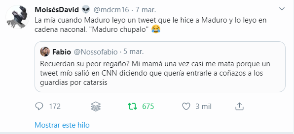 Era el año 2015, Maduro estaba molesto por los resultados del 6D donde perdió la mayoría del parlamento y durante su intervención en cadena nacional de radio y televisión, trató de ganar la simpatía de la audiencia leyendo algunos tuits de las redes sociales pero el primero que se encontró fue el legendario “Maduro Chúpalo” escrito por un joven venezolano llamado Moíses David. Aquel momento quedó registrado como uno de los más épicos en la cultura popular venezolana; pues Maduro, un presidente con poca aceptación por los venezolanos, fue humillado en su propio programa de televisión.